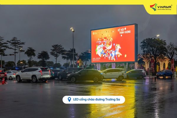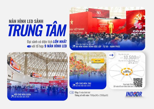 Trên nền tảng ấy, hệ thống LED do VINAMA đầu tư và vận hành được triển khai theo một cấu trúc đồng bộ từ ngoài trời đến bên trong các đại sảnh. Từ các trục đường Hoàng Sa – Trường Sa dẫn vào trung tâm, khu vực quảng trường phía trước, đến sảnh chính và toàn bộ không gian triển lãm, thương hiệu được duy trì trong một hành trình liền mạch.